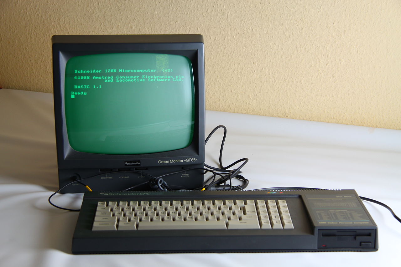 Poprzedni obrazek Następny obrazek Amstrad128 1989 – komputer Amstrad-Schneider 128 kB. Pierwszy komputer na dyskietki 3”, IBM wprowadził 3,5” dyskietki pół roku później. System operacyjny BASIC 1.1