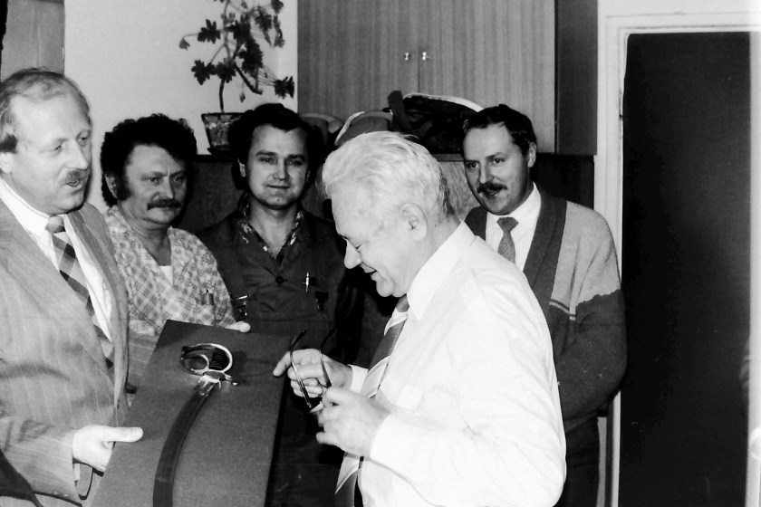1990- dyrektor Techniczny PZGraf w Łodzi pan Aleksander Znosko w momencie przyjmowania szabli pamiątkowej od współpracowników z racji przechodzenia na emeryturę. Po lewej Waldemar Deroń gł. energetyk, Apolinary Przybyłowski kierownik Warsztatu Elektrycznego.