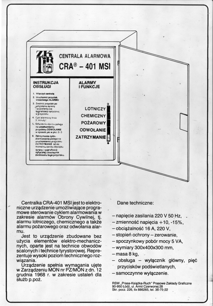 Poprzedni obrazek Następny obrazek CRA-401 MSI Pierwsza strona z opisu Projektu wynalazczego z 1982 roku, „Elektroniczna centrala rozgłaszania alarmów akustycznych w PZGraf w Łodzi”.