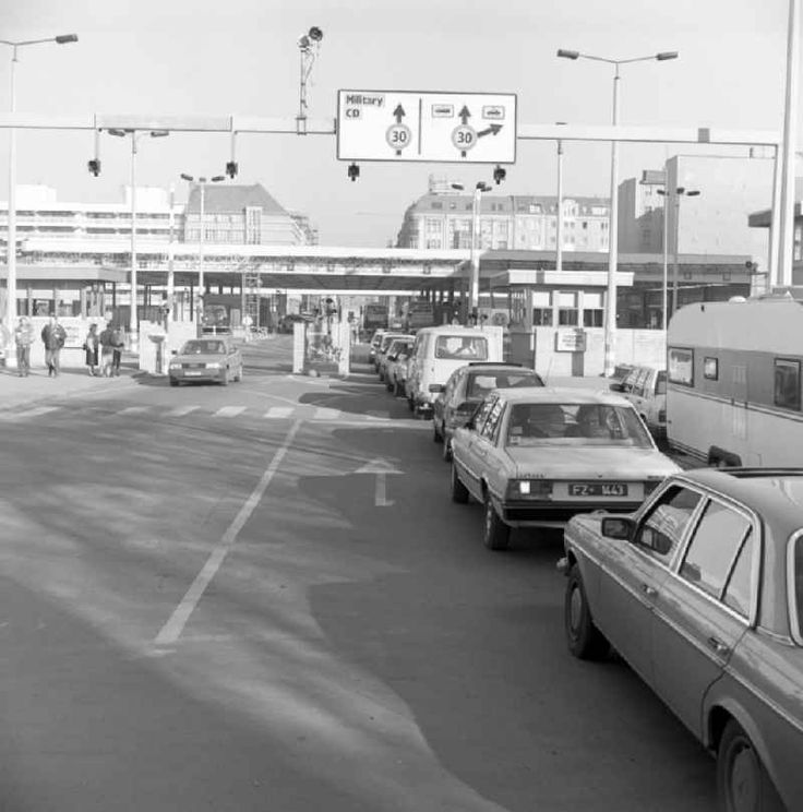 1989 Berlin. Widoczne właściwe przejście graniczne oddalone za pawilon najsłynniejszego – Checkpoint Charlie. Łączył on sektory radziecki i amerykański. Punkt kontrolny był otwarty tylko dla personelu wojskowego i ambasad alianckich, obywateli zagranicznych i pracowników Stałej Misji Republiki Federalnej Niemiec w NRD, a także urzędników NRD. Nad konstrukcją bramy widoczne tablice rozdziału pasów ruchu na kategorie militarne i pozamilitarne. Po lewej pojazdy wjeżdżające do Berlina Wschodniego (NRD) a po prawej pojazdy kierujące się do Berlina Zachodniego i do RFN. Zdjęcie: Manfred Uhlenhut