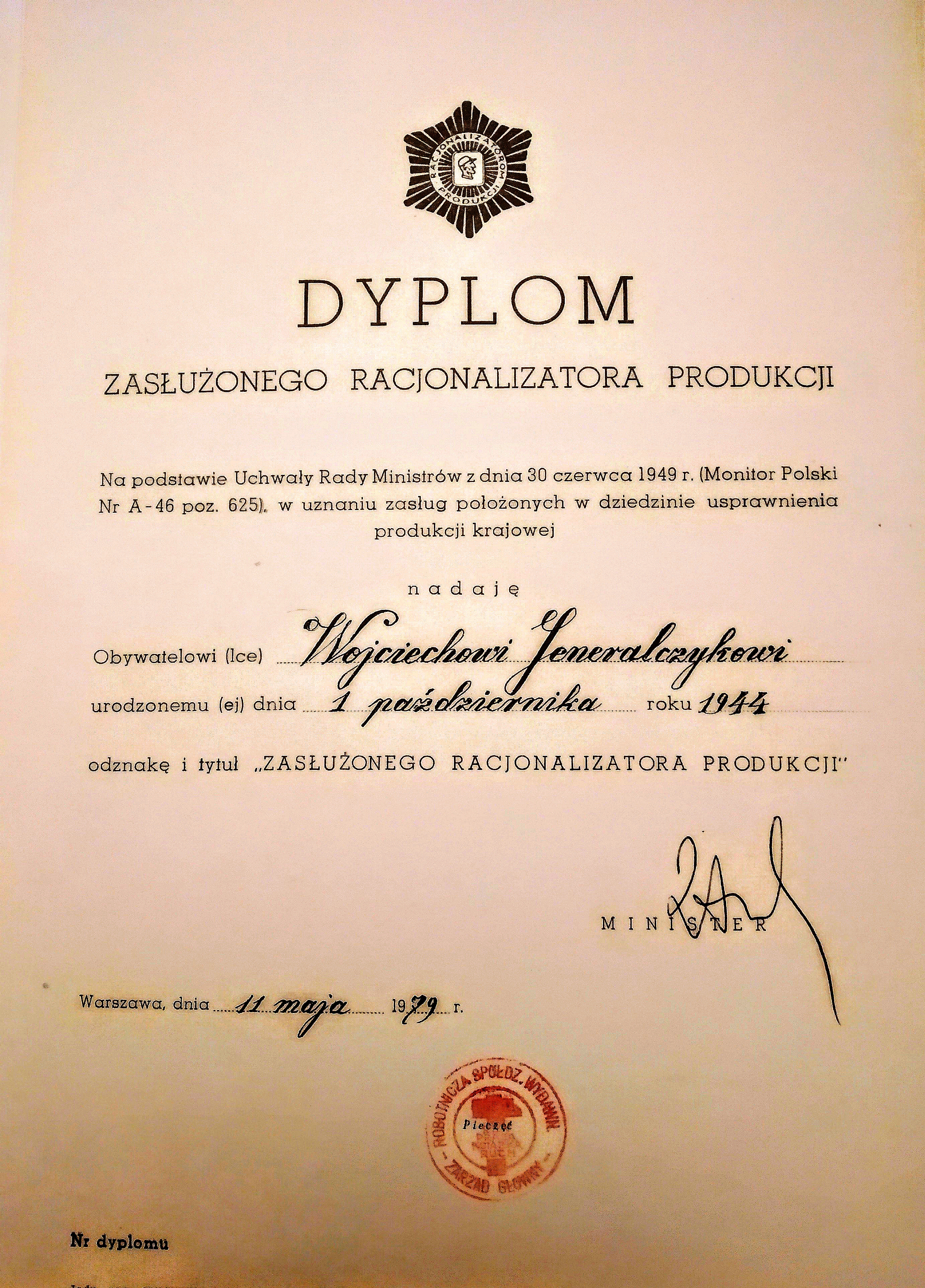 Poprzedni obrazek Następny obrazek DZRP-WJ 1979 – Dyplom nadania tytułu oraz odznaki „Zasłużony Racjonalizator Produkcji”