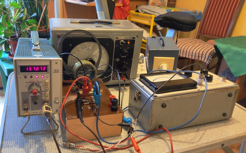 Poprzedni obrazek Następny obrazek FRezFD157 Domowe laboratorium, strojenie obwodów rezonansowych, miliwoltomierz tranzystorowy INCO, 30Hz-300kHz, 1mV-300V, generator sinusoidalny RWG-2, 50 Hz-500 kHz, częstościomierz cyfrowy Tektronix, 50Hz-550MHz, max. 10Vpp..