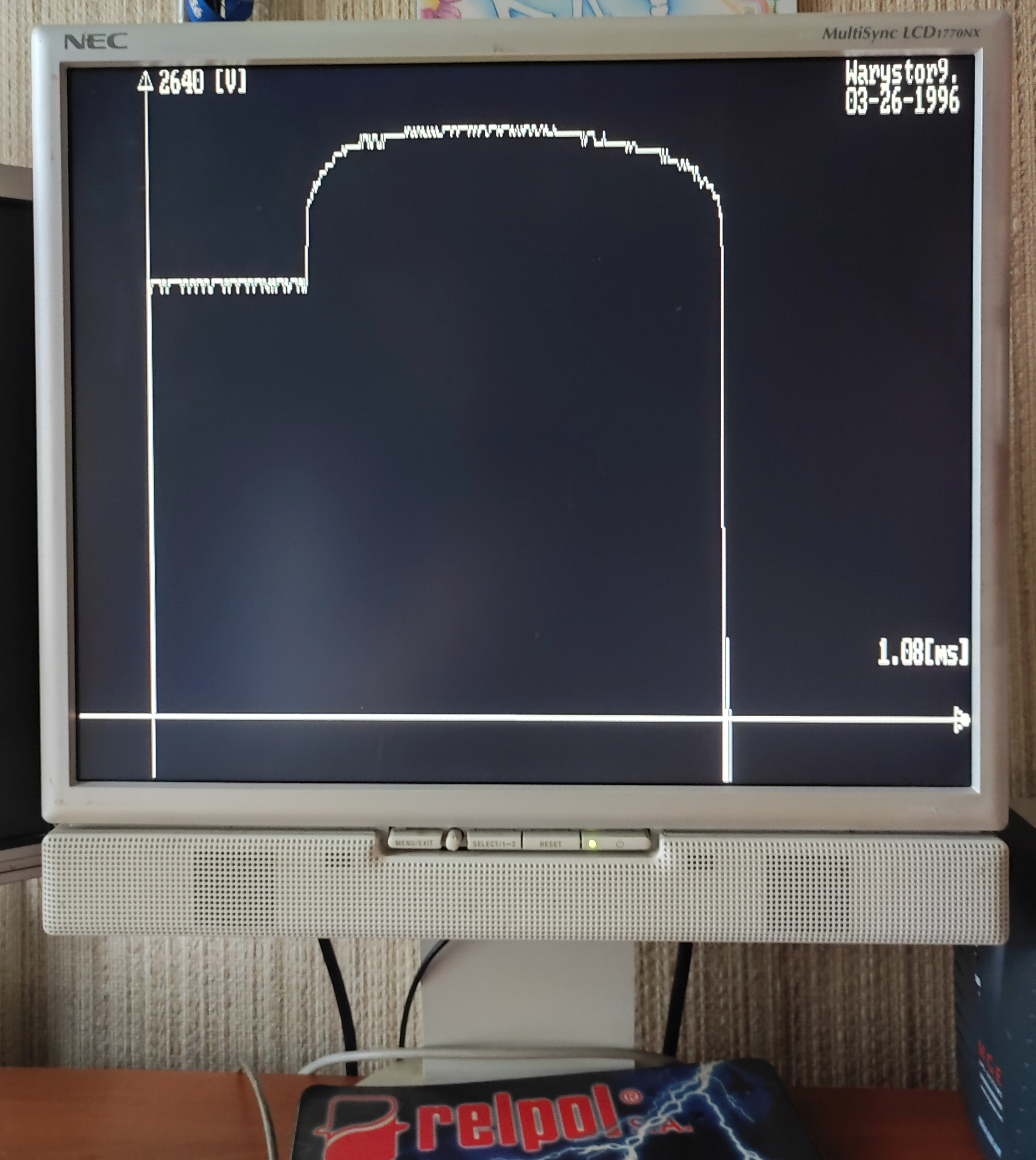 2025 – Uprzednio wybrana opcja „Rysuj na ekranie”, wpisana nazwa pliku i ENTER, ukazuje się przebieg prądu podczas badań wybranego warystora. Weryfikujemy dane pomiaru wg danych amplitudy i półokresu impulsu prądu. Naciśnięcie kolejne Enter potwierdzamy dokonaną weryfikację prądu, na ekranie ukazujesię wówczas przebieg zarejestrowanego podczas próby napięcia ograniczenia warystora badanego. Weryfikujemy jego wartości i potwierdzamy Enter.