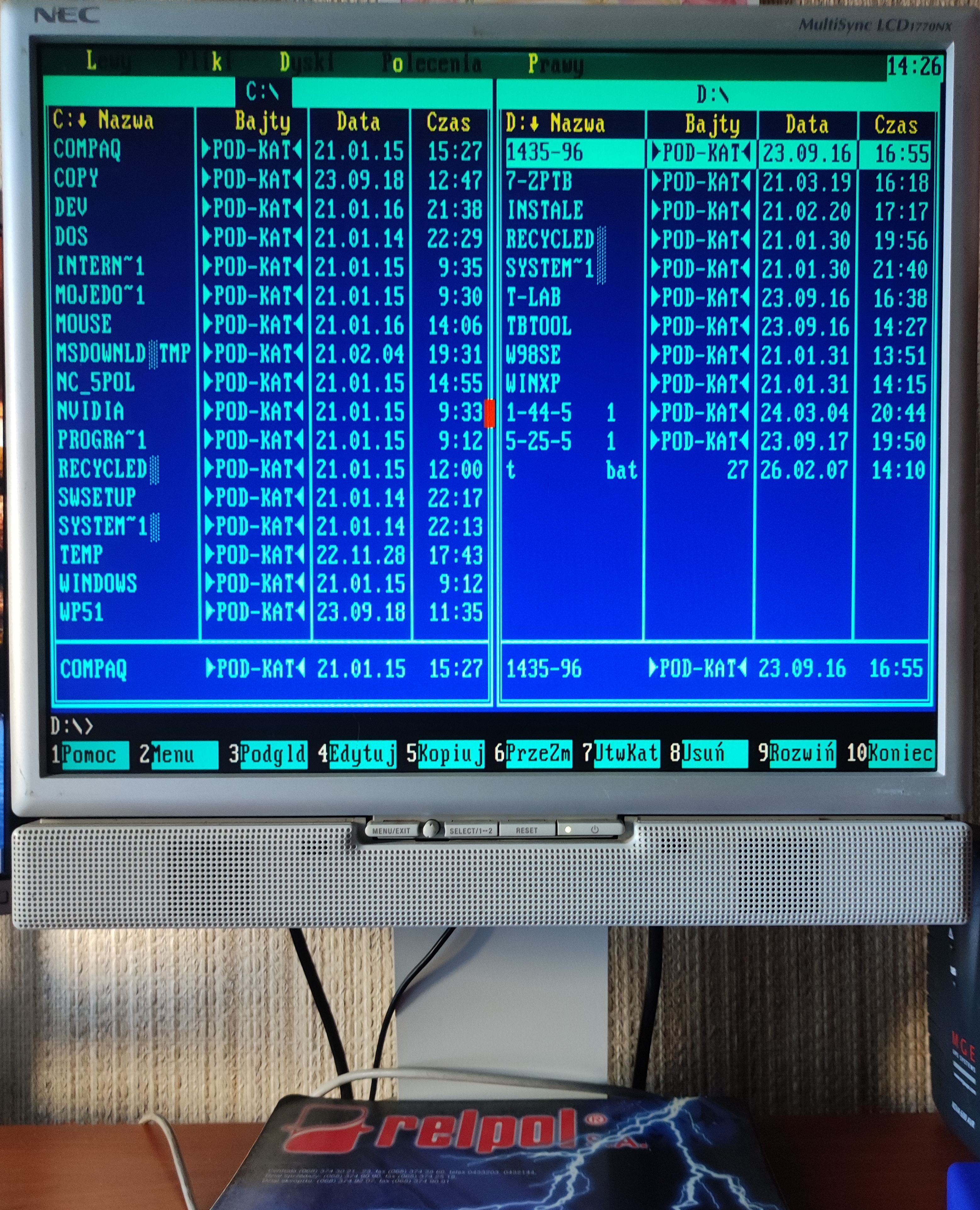 2025 – po zalogowaniu do systemu Windows’98 PL, przechodzę do zamknięcia i wybieram opcję „otwórz w MS DOS”. System otwiera nakładkę Norton Commander 5.0 PL na archiwalnym Mini Tower Fujitsu Siemens SCENIC, Intel Pentium III do Windows 2000 Professional 1-2 CPU