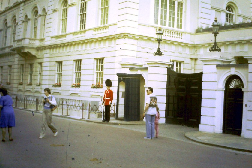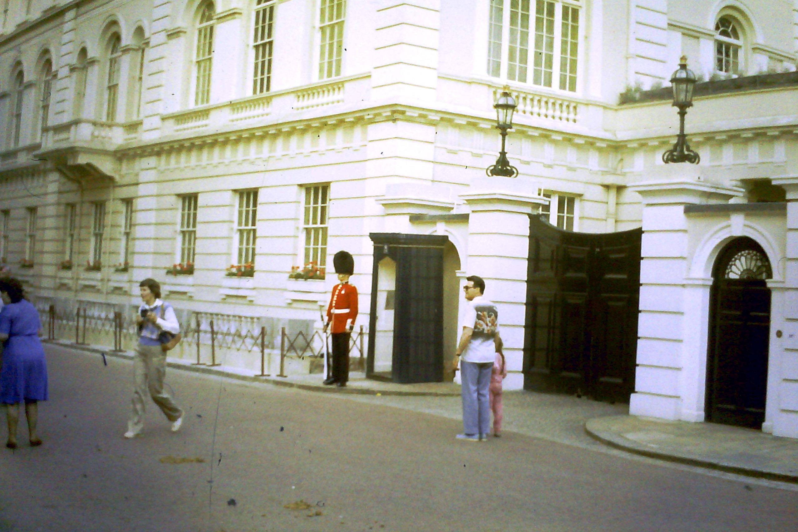 Poprzedni obrazek Następny obrazek Gard-2 1985-Gwardzista Króleski na posterunku w tradycyjnym stroju „czerwona kurtka” i czapa z niedźwiedziego futra, Londyn