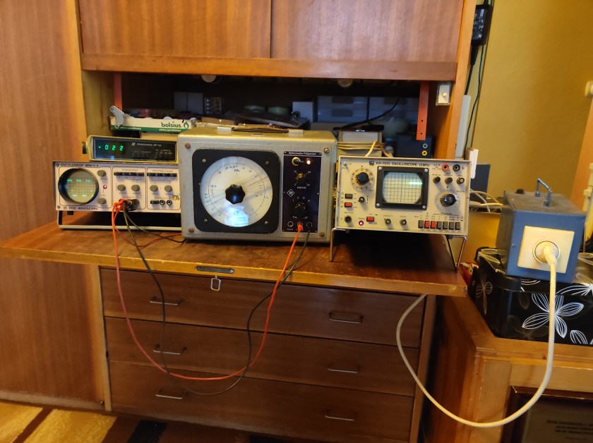 Poprzedni obrazek Następny obrazek KabidOsc Domowe laboratorium, oscyloskopy MINI 5A oraz KABID KR 7010, multimetr cyfrowy BP-11A, generator sinusoidalny RWG-2, 50Hz-500kHz.