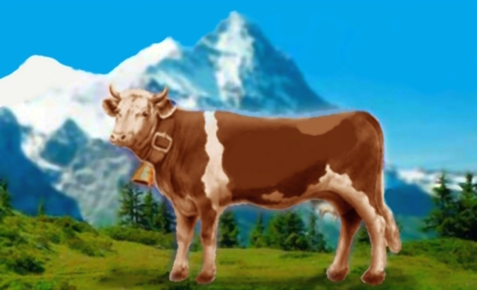 Poprzedni obrazek Następny obrazek KraftFuds Szwajcarska „czekoladowa krowa” na wysokogórskim pastwisku, widok z kolejki zębatej w drodze na Rigi Kulm (autorska adaptacja graficzna krówki okładkowej, mlecznej czekolady Kraft Foods Group)
