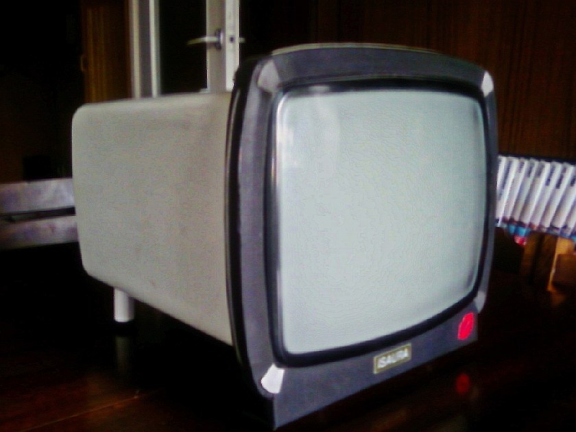 ISAURA – Początek lat 90′ tych, zdjęcie przedstawia własnoręcznie wykonany monochromatyczny monitor TV którego obudowę stanowi adaptowane plastikowe wiaderko do noszenia płynów. Monitor miał wejście analogowe audio wideo m. cz. i wyjście kablowe BNC poprzez modulator magnetowidowy w. cz.