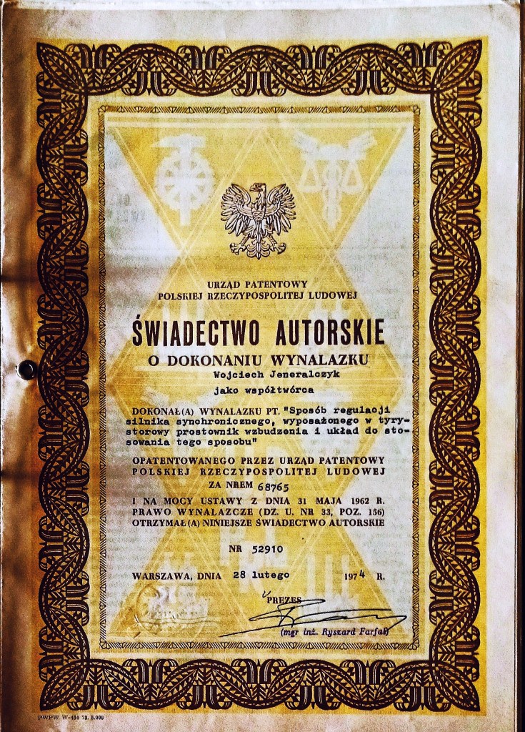 Poprzedni obrazek Następny obrazek Patent-1 1974 – świadectwo autorskie wynalazku sposobu i układu do sterowania i regulacją przekształtnikiem statycznym zasilającym wzbudzenie silników synchronicznych dużej mocy.