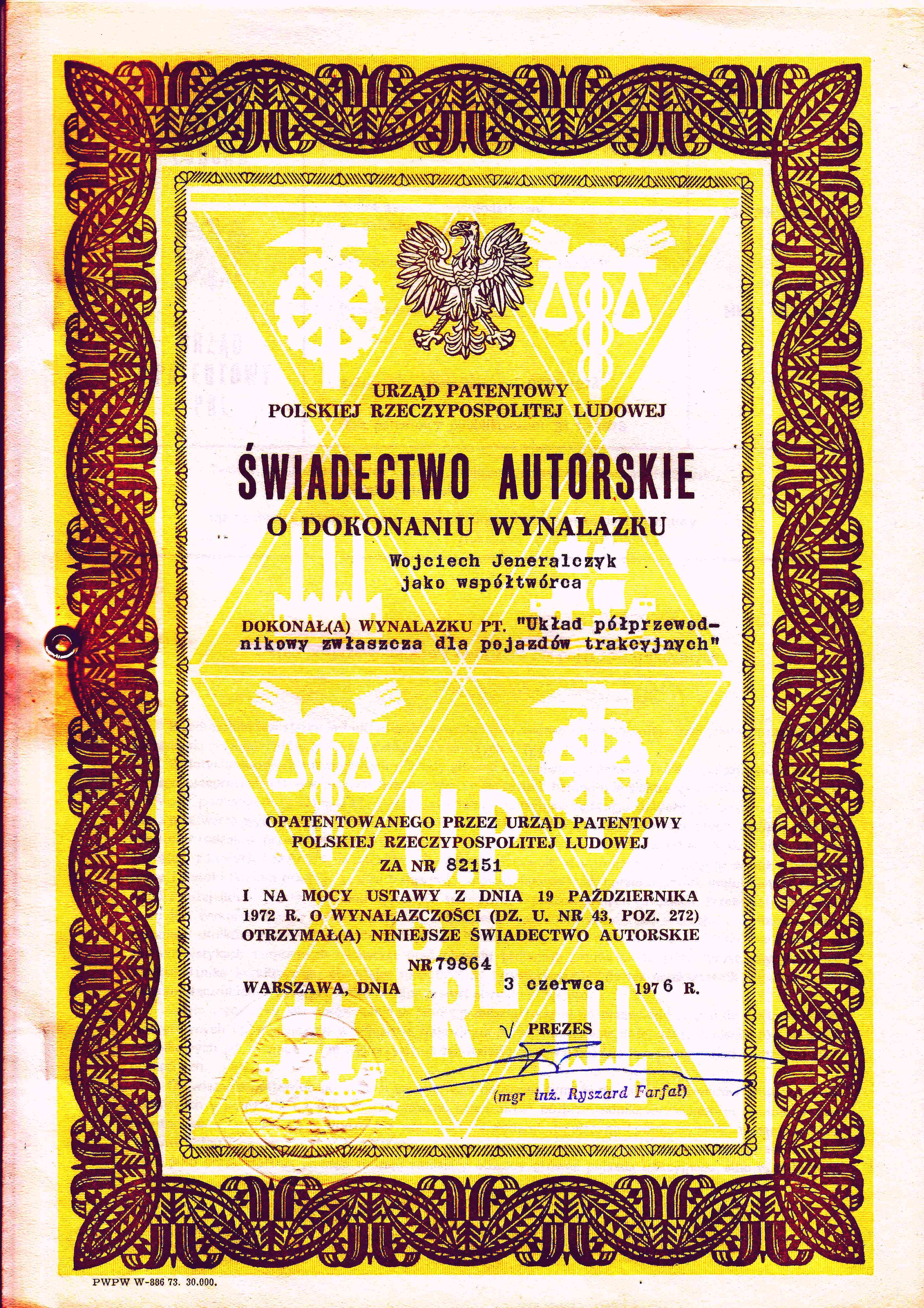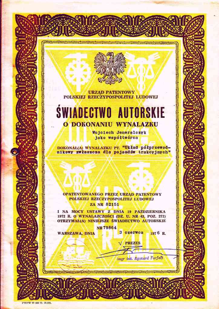 Poprzedni obrazek Następny obrazek Patent-2 1976 – świadectwo autorskie wynalazku układu półprzewodnikowego dla pojazdów trakcyjnych