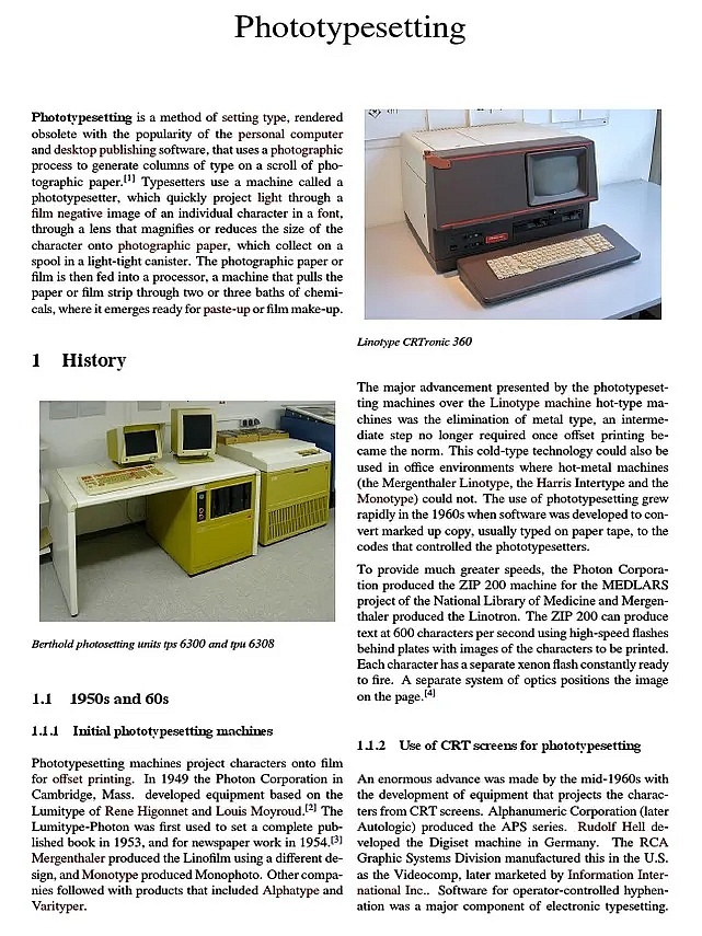 Poprzedni obrazek Następny obrazek Phototypeseting Artykuł Paula Zorzi o urządzeniach i metodach fotoskładu. Omawia również metodę z miniaturową lampą CRT zastosowaną w LINOTYPE CRTronic.