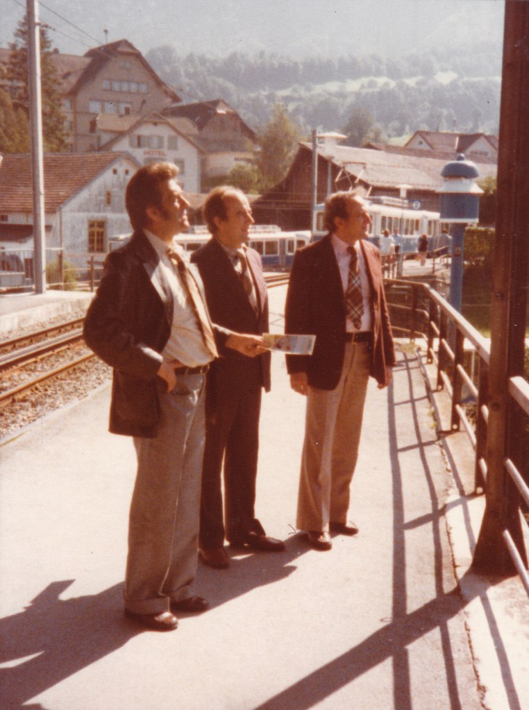 Poprzedni obrazek Następny obrazek RigiKulm 5-78-2 Goldau Szwajcaria, dolna stacja zębatej kolejki wysokogórskiej (Zahnradbahn), w maju 1978 ( gł. technolog Janusz Hübner, gł. mechanik Tadeusz Kuśmirek, gł. elektronik Wojciech Jeneralczyk)