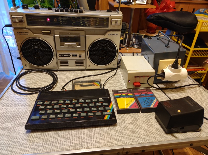Poprzedni obrazek Następny obrazek SPECTRUM-1 1990-pełny zestaw mikrokomputerowy jaki zastosowaliśmy w domowej pracowni programowania, radiomagnetofon Sanyo, interfejs standaryzujący odczyt programów z kaset audio o różnej jakości nośnika.