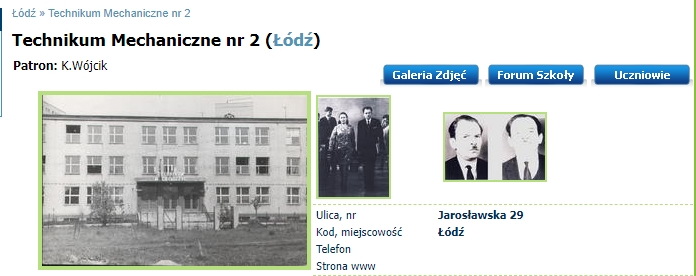 Pierwsza praca Jagódki, Technikum Mechaniczne nr 2, profil wirtualny na nie istniejącym Blogu „Nasza Klasa”. Po lewej budynek Szkoły widok od strony ulicy Gagarina (Paderewskiego), w środku wicedyrektor Zboromirska oraz dyrektor Stefan Cezary Przybysz. Ten sam Stefan Cezary Przybysz, mój pamiętny wicedyrektor z Technikum Energetycznego, które ukończyłem w 1963 roku. Portretowe także po prawej