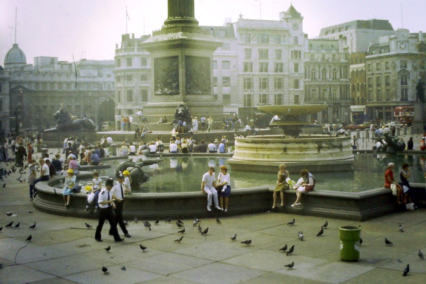 Poprzedni obrazek Następny obrazek TrafSqare 1985 – Londyn, fontanna pod kolumną Nelsona na Trafalgar Sqare.